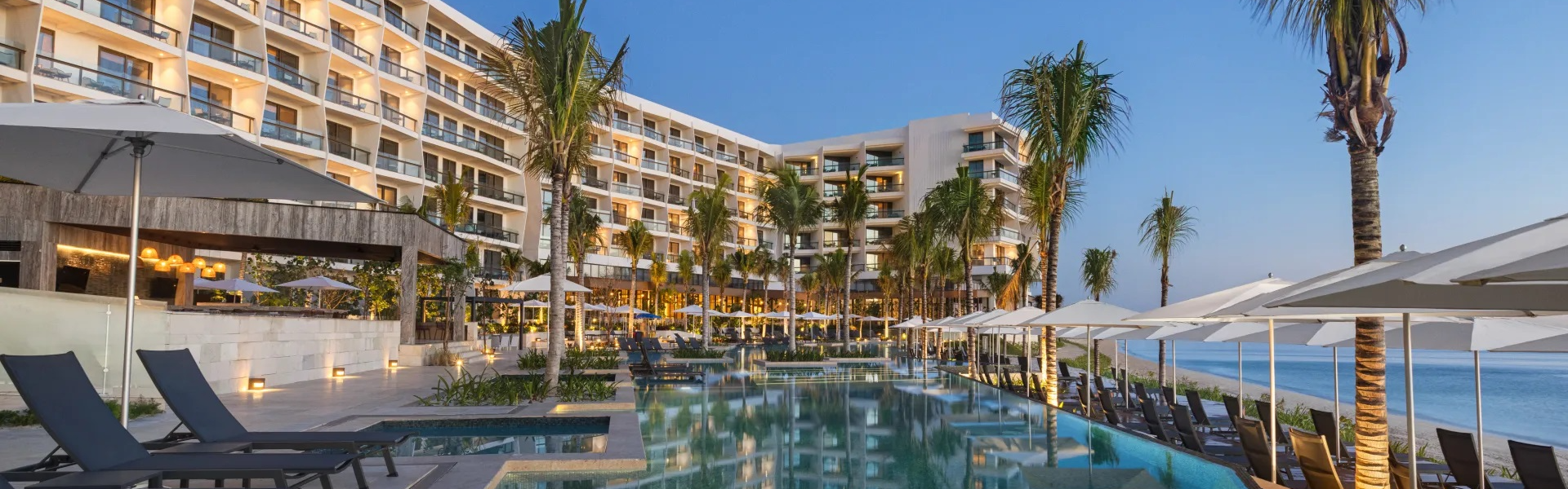 The Hilton Cancun All Inclusive Resort Riviera Maya in Mexico is located directly on a Riviera Maya beach near the Cancun area.